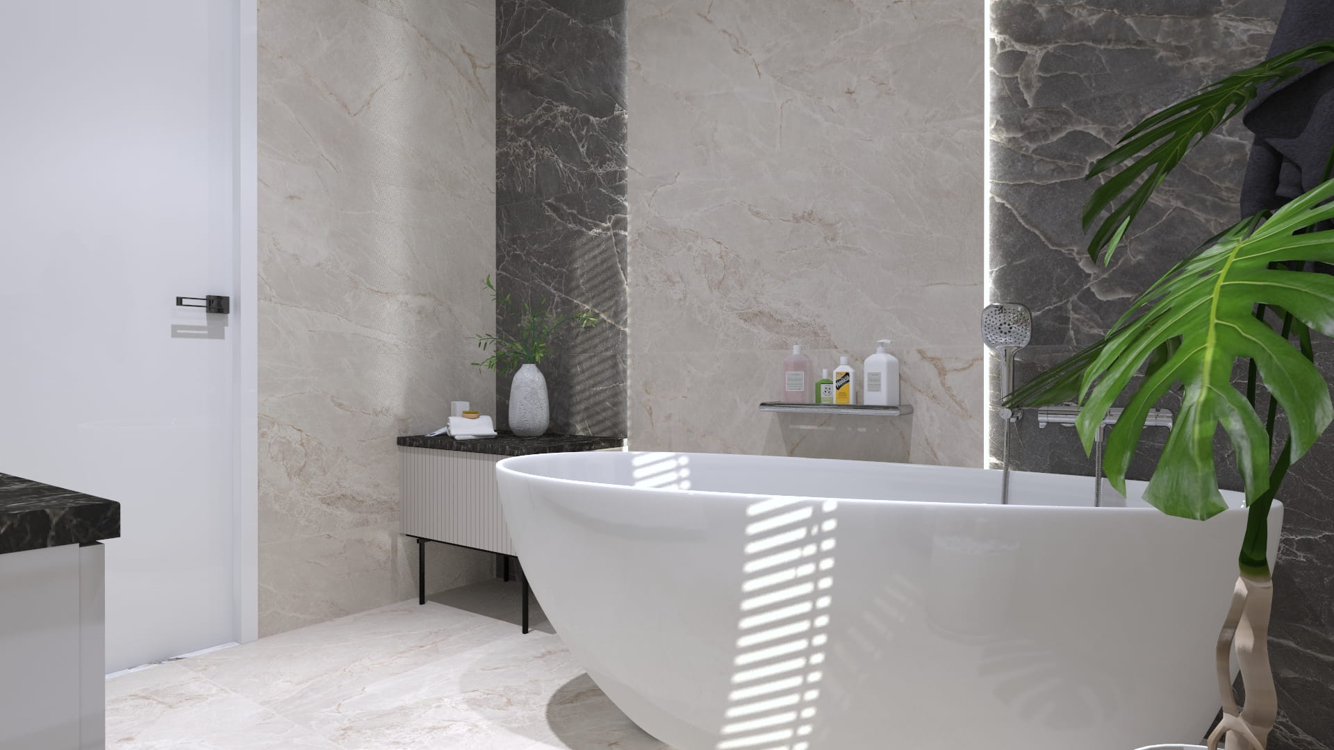Perfekcyjna tafla: Rektyfikowane krawędzie umożliwiają montaż z minimalną fugą. Dzięki temu ściana wygląda jak wykonana z jednego, gigantycznego bloku marmuru Portoro.