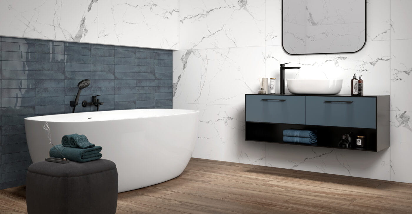 Perfekcyjna tafla: Rektyfikowane krawędzie i duży format 60x120 cm pozwalają stworzyć jednolitą, niemal bezspoinową powierzchnię, która optycznie powiększa przestrzeń i dodaje jej oddechu.