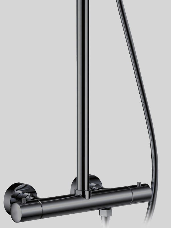 Kolumna prysznicowa termostatyczna w kolorze tytanowym łączy najnowsze technologie z eleganckim designem, idealnie wpisując się w nowoczesne wnętrza łazienek. Wykonana z mosiądzu i pokryta wykończeniem PVD, bateria prysznicowa nie tylko prezentuje się estetycznie, ale także jest wyjątkowo trwała i odporna na zarysowania oraz korozję.