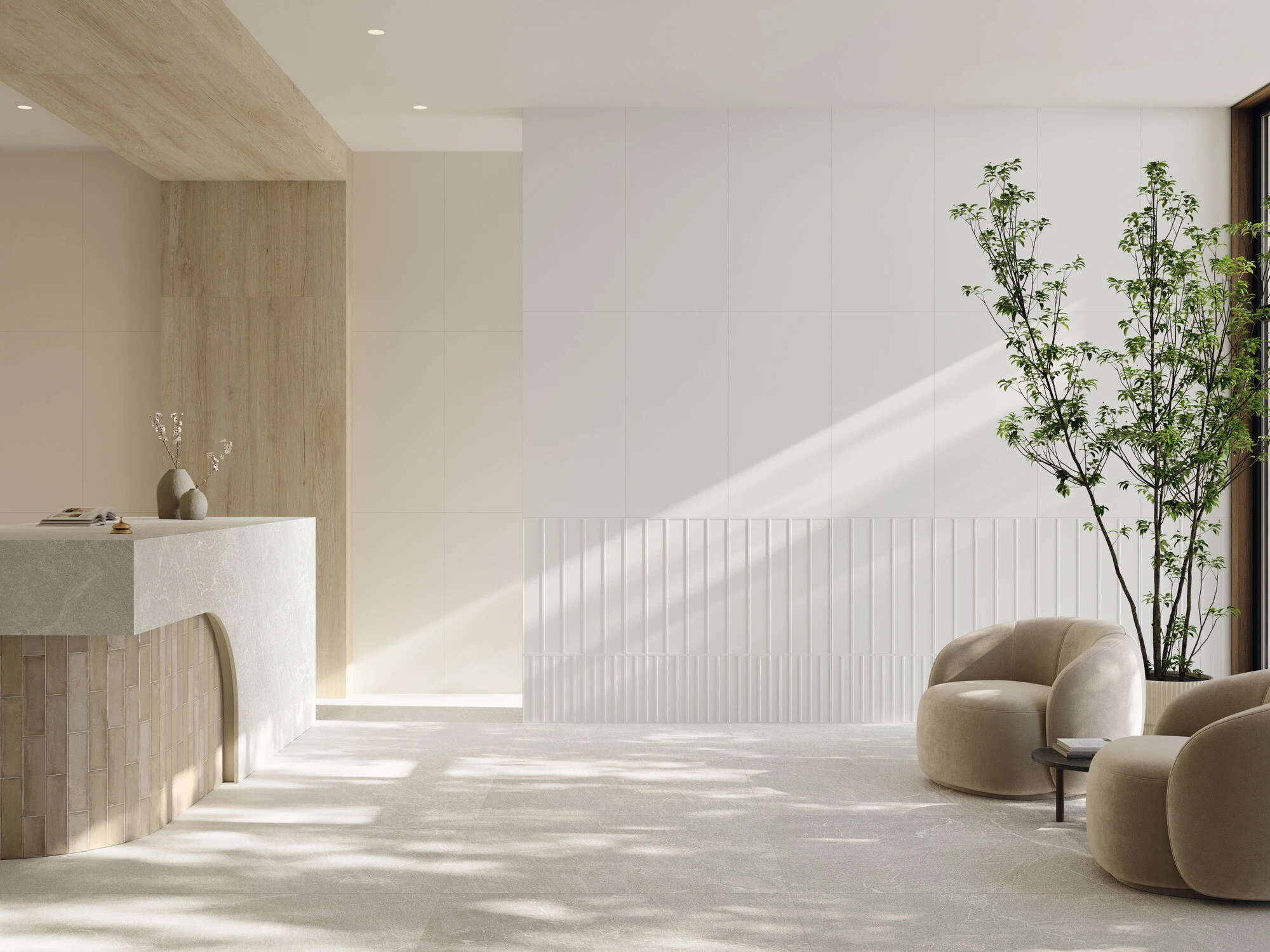 Idealne dopasowanie: Dzięki precyzyjnej rektyfikacji, montaż na minimalną fugę (1-1,5 mm) pozwala uzyskać efekt, którego nie da się osiągnąć mniejszymi formatami.
