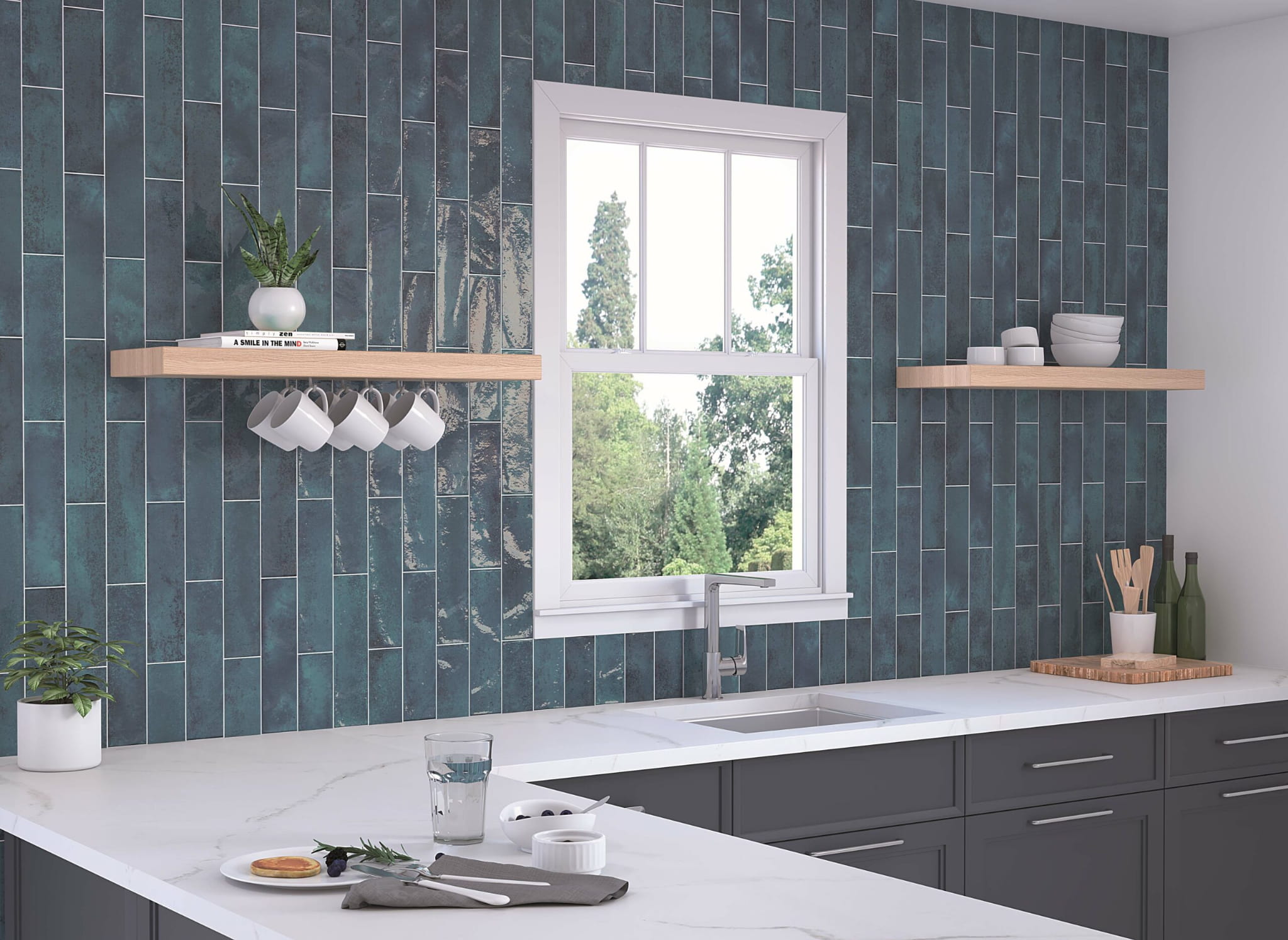 Nowoczesny Klasyk: Smukła cegiełka to format ponadczasowy. Ułożona w jodełkę (Herringbone), wydobędzie z koloru Blue to, co najpiękniejsze – grę cieni i refleksów.