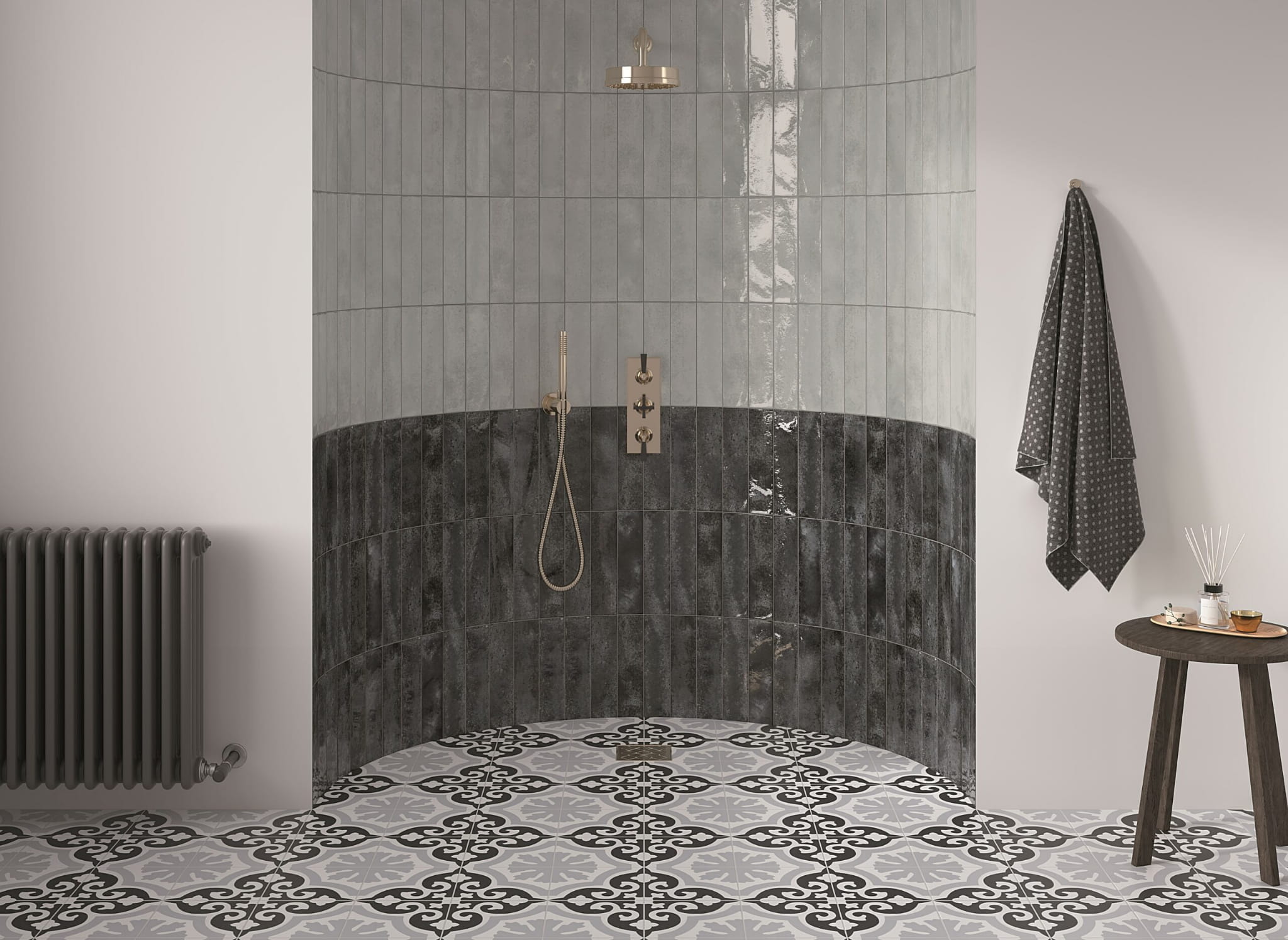 Mistrz Praktyczności: Na cieniowanej, szarej powierzchni połyskującej płytki zacieki z wody czy smugi są niemal niewidoczne. To najłatwiejszy do utrzymania w czystości kolor z całej serii.