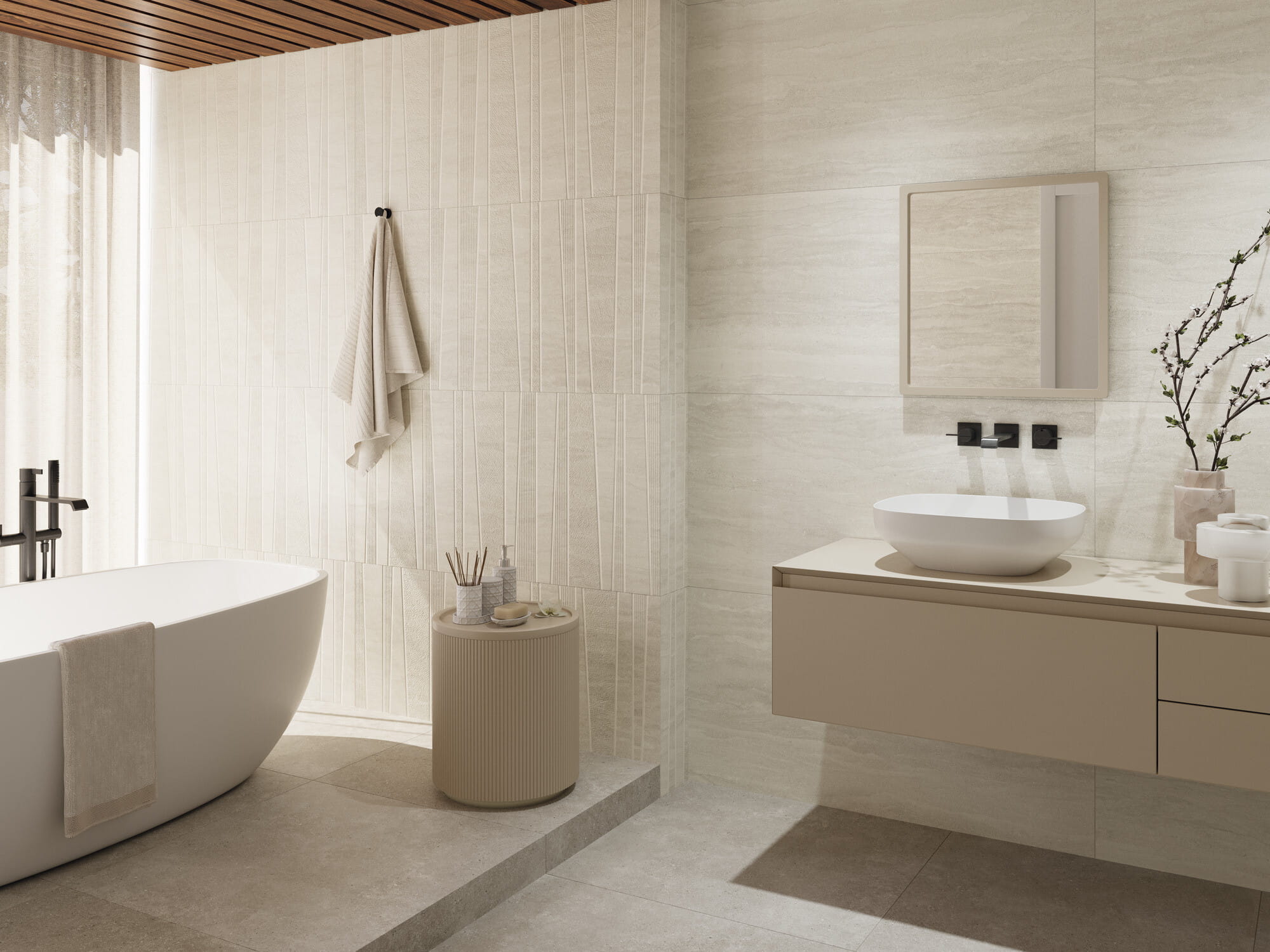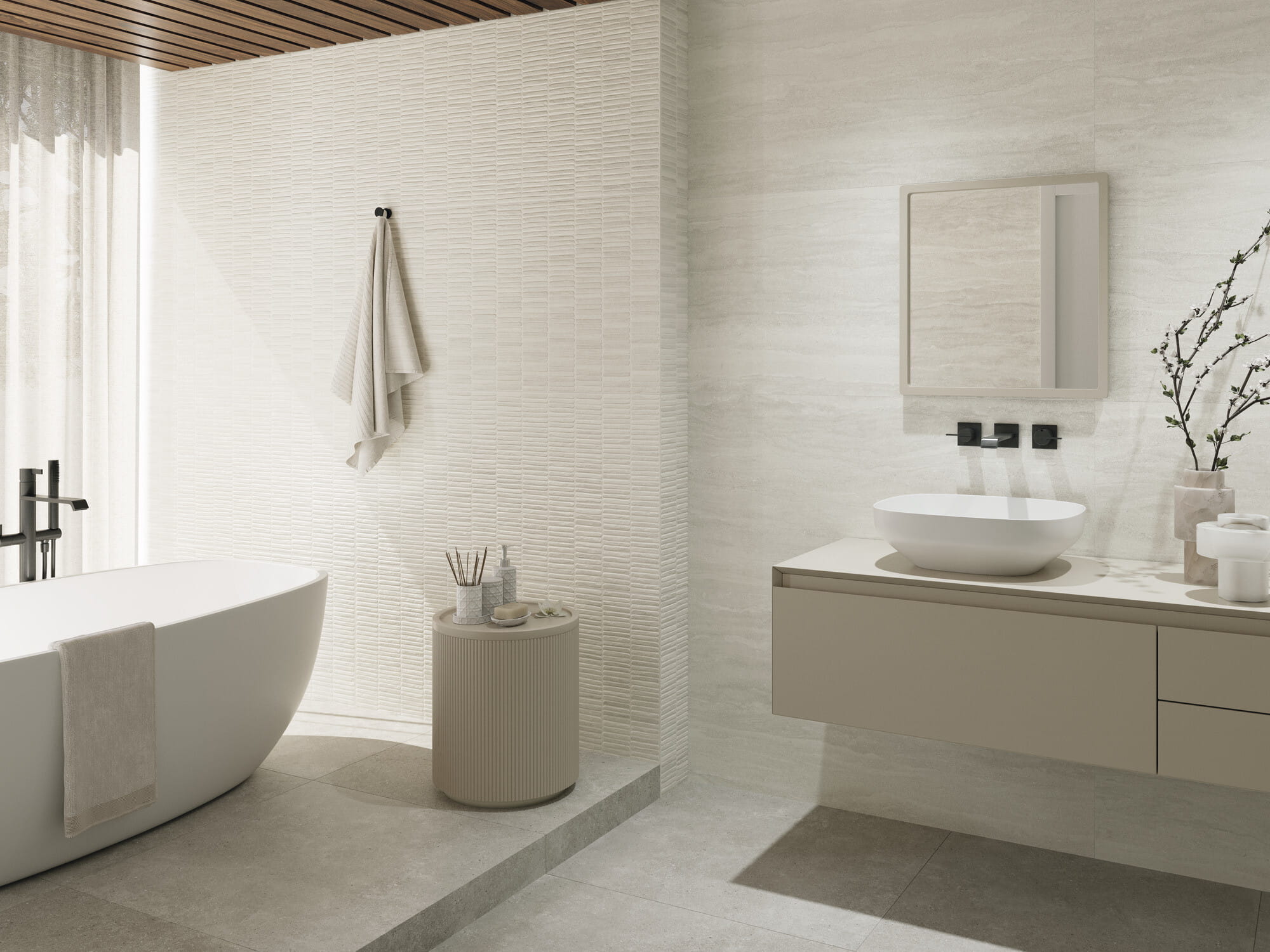 Format stworzony do kreowania przestrzeni. Zastosowanie wymiaru 60x120 cm na ścianie całkowicie zmienia proporcje pomieszczenia. W układzie pionowym płytka optycznie „wyciąga” łazienkę w górę, nadając jej monumentalny wygląd. W układzie poziomym – poszerza optycznie przestrzeń, tworząc uspokajający rytm. Dzięki precyzyjnej rektyfikacji fugi stają się niemal niewidoczne, co pozwala uzyskać efekt luksusowej, kamiennej okładziny.