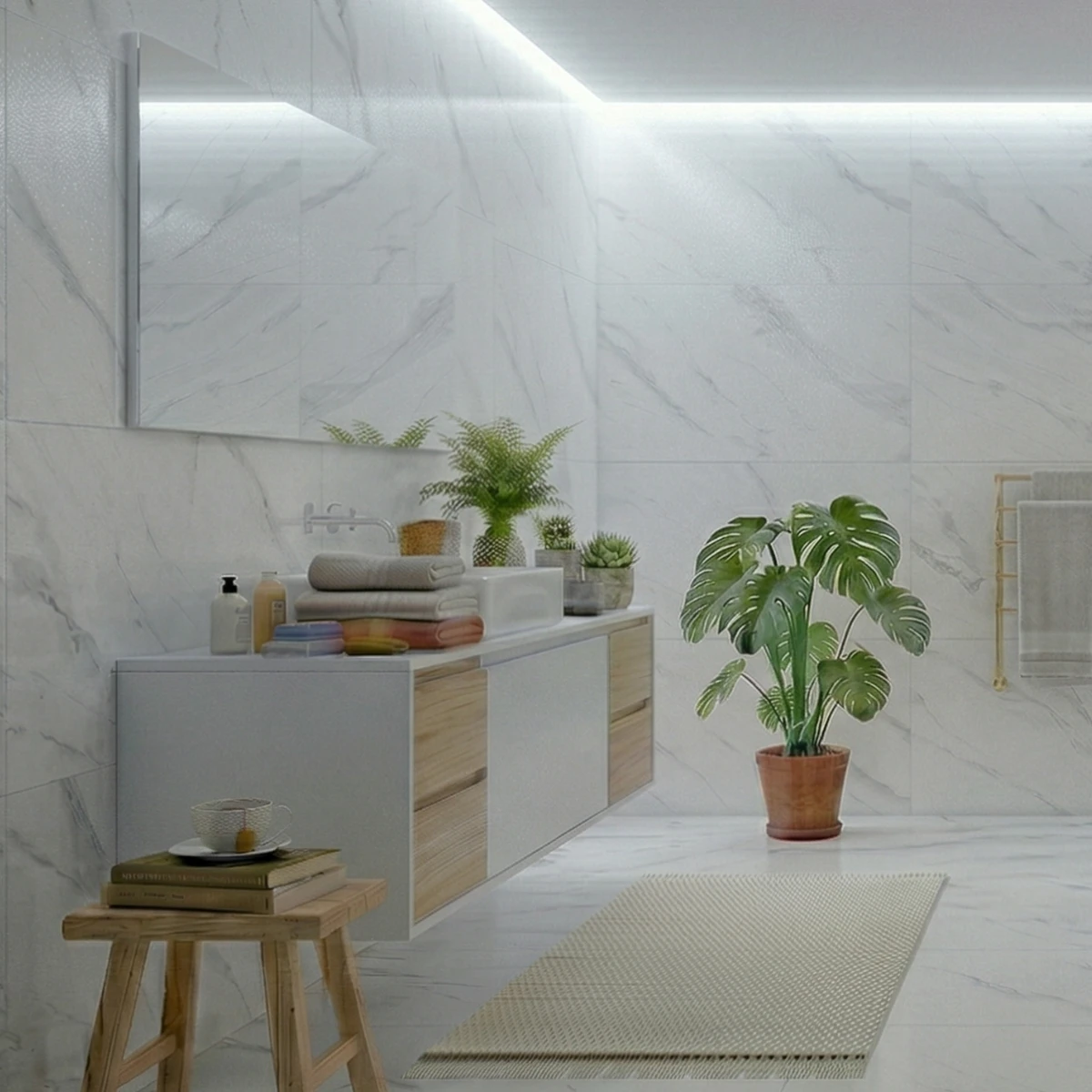 SCALA STATUARIO doskonale komponuje się z czarną armaturą, drewnem oraz dodatkami w kolorze złota lub chromu. Może stanowić główny element aranżacji lub eleganckie tło dla bardziej wyrazistych akcentów.