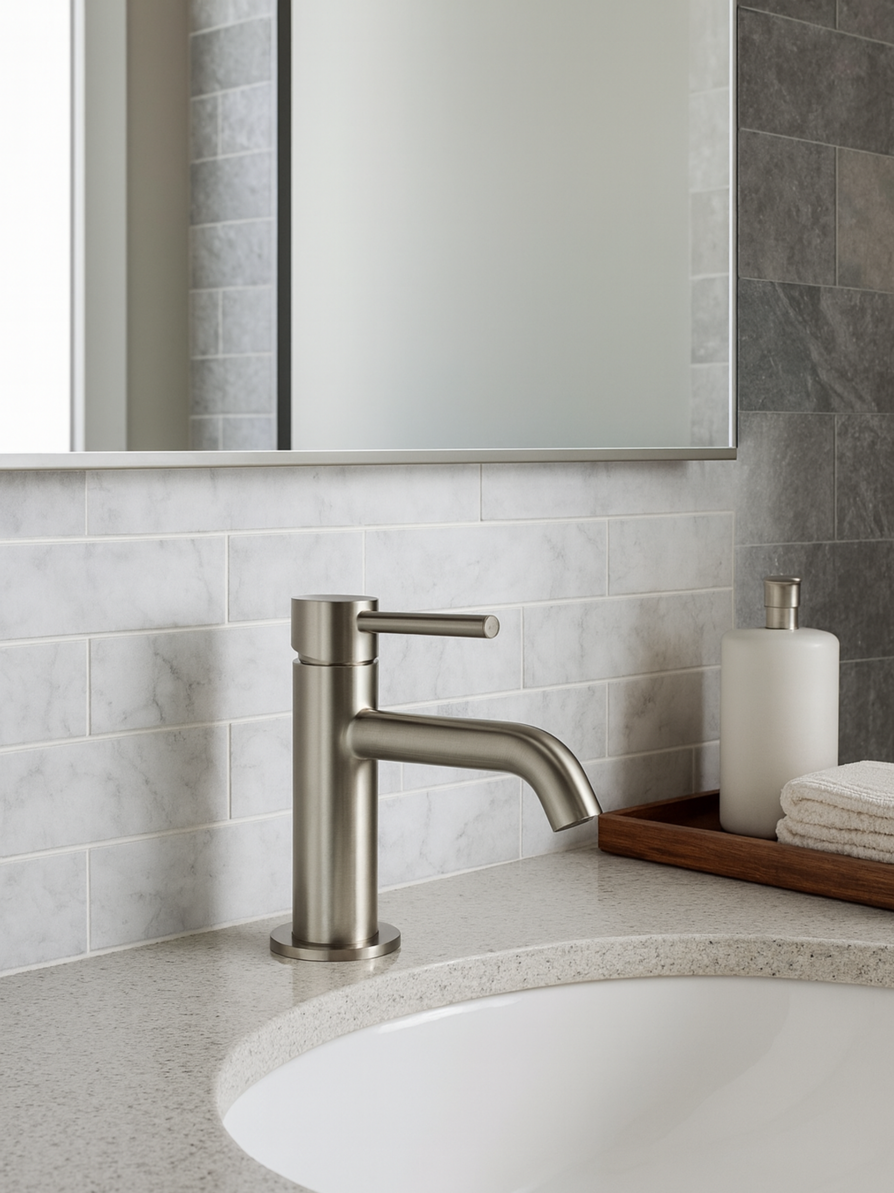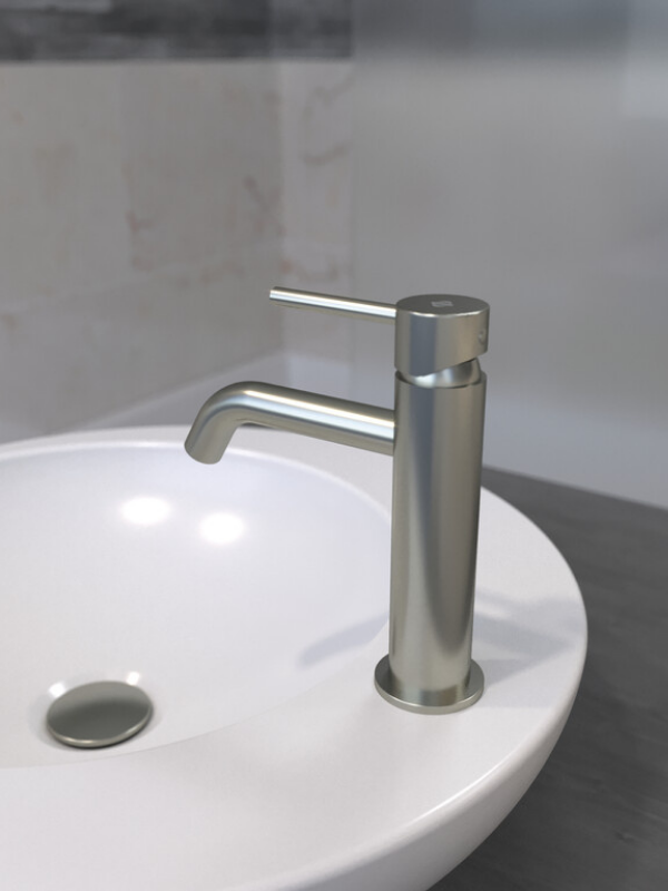 Niska bateria umywalkowa Sirio w kolorze nickel z powłoką PVD to połączenie najnowszych technologii z eleganckim designem, zapewniające trwałość, wydajność i estetyczny wygląd w każdej łazience.