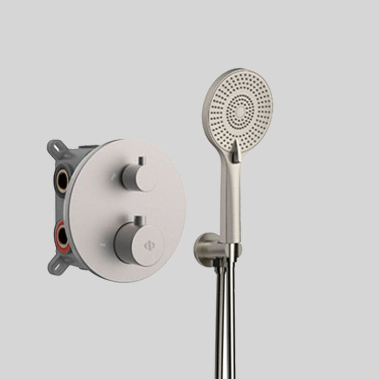 Bateria prysznicowa podtynkowa to zaawansowany zestaw termostatyczny, stworzony z myślą o nowoczesnych i eleganckich łazienkach. Wyróżnia się wykończeniem w modnym odcieniu nickel, który świetnie komponuje się z surowymi materiałami, czernią oraz naturalnym drewnem.